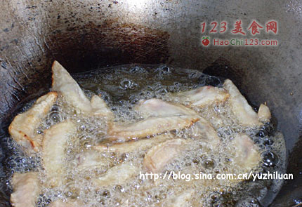 2、锅里放油烧热,将翅尖放到锅里,小火炸成金黄色,炸好后捞出来控净油,把尖椒圈也放到锅里炸一下,捞出来。