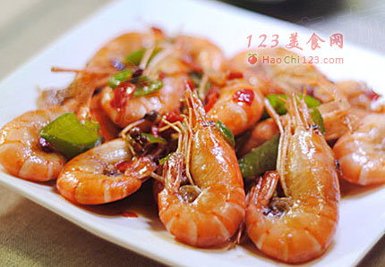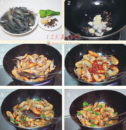 3、倒入鲜虾翻炒至虾壳微变红,烹入几滴料酒。