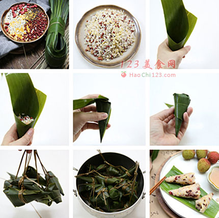 3、取一张粽叶,从中间卷起成一个小漏斗型。