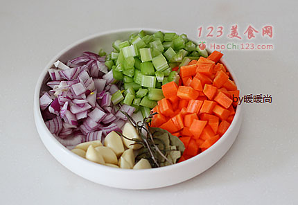 2、胡萝卜、洋葱、西芹处理干净后切指甲盖大小的丁,大蒜、香叶、干的迷迭香(没买到百里香用了干迷迭香,没有也可不放)备好待用。