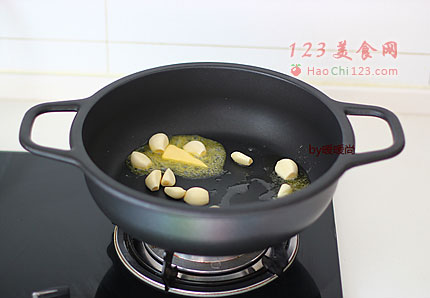 3、锅子提前预热,放黄油、大蒜炒出香味。