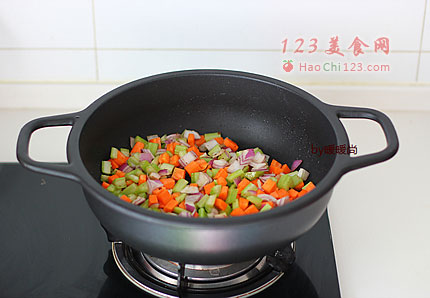 6、利用煎牛尾的余油将胡萝卜、洋葱和西芹丁炒软,关火。