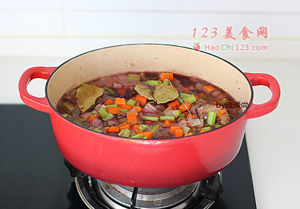 7、将炒好的蔬菜丁转至汤锅中,加香叶、迷迭香、冰糖大火烧开转小火炖90分钟。