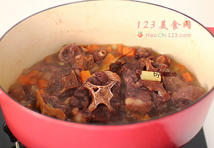 2、红酒入菜很容易上色,这次炖牛尾我手滑放多了,导致成品颜色过深,预估1000g的牛尾放200ml的红酒足够了。