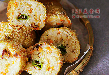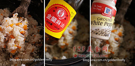 4、米饭蒸好后开盖加入香麻油+盐+白胡椒粉,用饭匙将所有材料拌匀成为素拌饭。