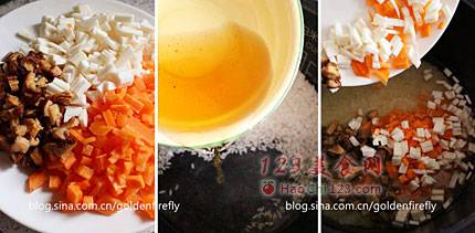 3、米锅中加入香菇水+清水,顶部放置香菇丁+红萝卜丁+笋丁,开始蒸饭,跳锅后保温焖饭约15分钟。