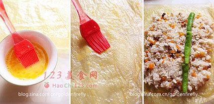 7、取一边开始往内卷,成为卷筒状,最后收边时在边缘再刷上蛋液,封口时豆皮就能确实黏紧,前后兩头的豆皮捏起即可。