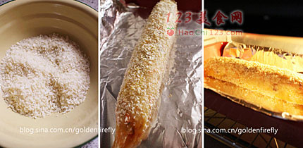 8、在豆皮卷的表面也刷上厚厚的蛋液,再滚上面包粉,双手可辅助轻压,让面包粉确实沾附在外表。