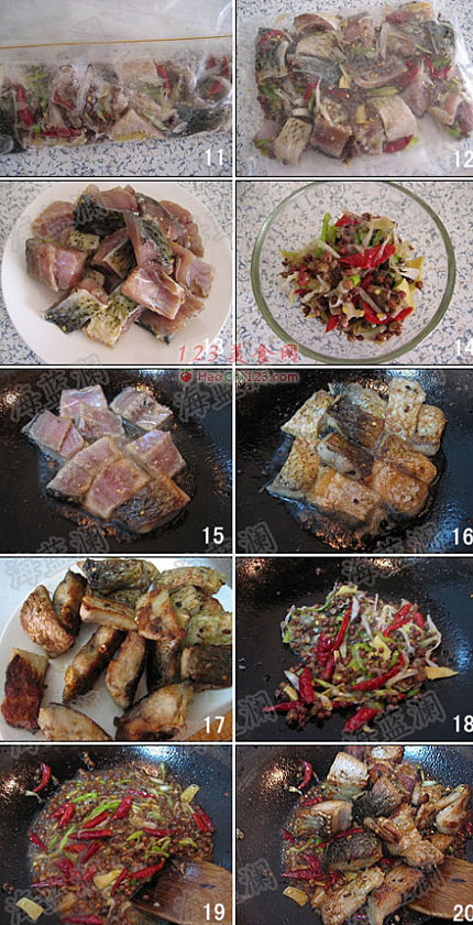 3、5-8图,加入干辣椒段,再倒入花椒,盐和料酒,轻轻的拌匀,可以用手抓拌。