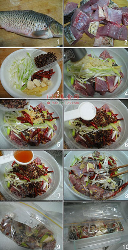 4、9-10图,将拌好的鱼块连同调料一起放入密封袋中,放入冰箱的冷冻室里腌制一周。