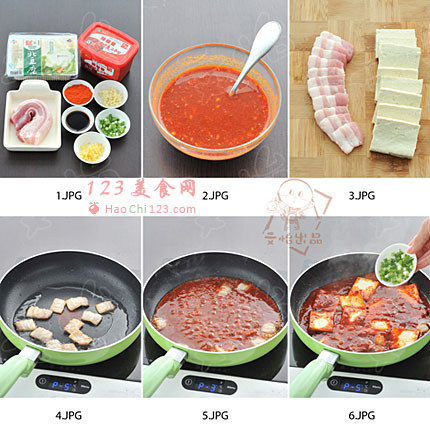 2、豆腐切成4cm长,2cm宽,1cm厚的片,五花肉洗净,切成3cm长,2cm宽,0.5cm厚的片,备用。