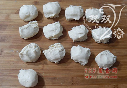 6、将发酵好的面团取出,揉匀(想要馒头光洁,组织细腻,就使劲的揉吧),将面团搓长,揪成小面剂(约60克一个)。