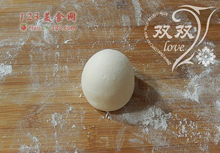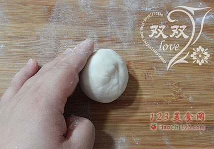7、取一个面剂,用手搓匀(由于面团较小,所以选择用手搓的方法来揉面。这一步是馒头光洁、组织细腻的关键。将面团里面的气泡全部搓出来,这样组织才会细。经过充分揉搓的面团,面团会非常柔顺,表面光亮),用手收拢截面,将截面朝下,滚圆。