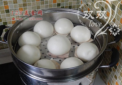 10、开火,将水烧开,自出热气开始计时,15分钟关火,焖3-5分钟开盖即可(小馒头,大约蒸12-15分钟,关火后不要着急开盖,略焖一会。有很多童鞋说馒头表面会有很多点点影响美观,那是水汽滴落导致的,不锈钢蒸锅的玻璃锅盖尤其容易造成,提起玻璃锅盖时要尽量快速。或者,干脆换一个草编锅盖)。