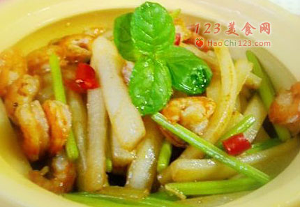 3、锅内放入鸡油,烧热后放入虾干、萝卜条大火爆炒,淋入高汤,加入盐和鸡精,改小火焖三、四分钟,大火收浓汤汁,加入香芹段,翻炒均匀即可出锅。
