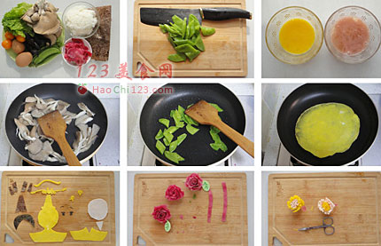 7、将蛋饼和海苔刻出需要的形状。