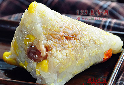 7、苇叶沿着第一步的折痕,向里折起苇叶,形成第四个角,这样就已经成粽了。