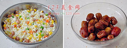 5、将苇叶按照折痕窝成漏斗状,里面装满馅料,蜜枣放在中间,这样煮好的粽子才甜味均匀。