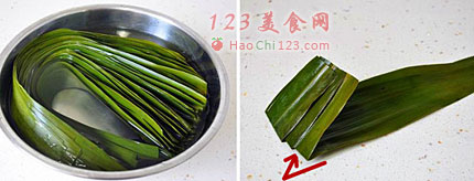 3、芦苇叶洗净,剪去两头,放开水中焯烫一下至全部变色就赶快捞出,然后泡在冷水中待用。