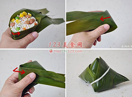 6、然后将漏斗后面的苇叶折过来盖上馅料,顺势用拇指食指卡捏着盖住两边。