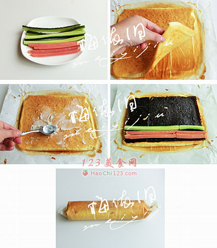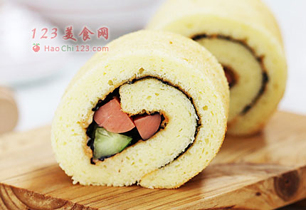 3、日式寿司蛋糕,有蛋糕柔软细腻的口感,又夹带着些黄瓜、火腿,似乎总能做出与众不同的口味,你也可按照自己口味添加点料,赋予蛋糕卷口感的特殊味道,更有一种特别的营养,十分美味。[sushi.laoyanhuo.com]
