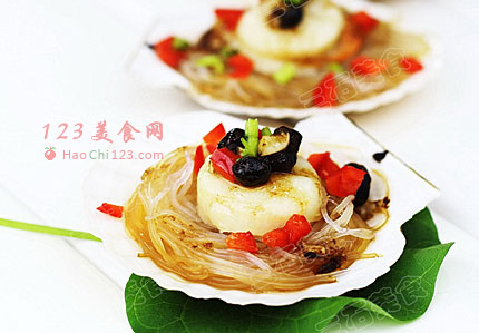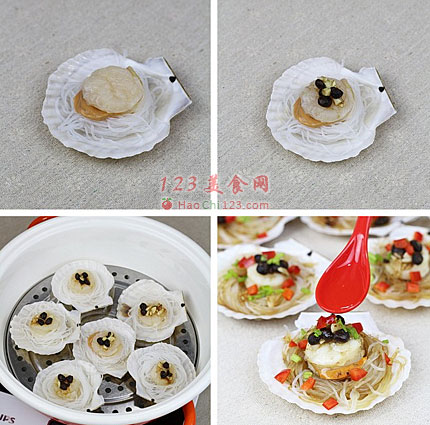 4、将泡软的粉丝剪断,用手指绕成圈,放入扇贝壳里,再把扇贝肉放在粉丝上。