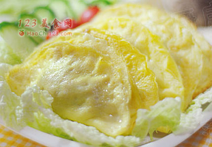 7、掀起一边蛋皮将肉馅覆盖住,轻压边缘至蛋饺粘合住即可。
