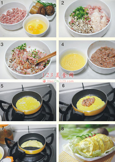 6、趁蛋液半凝固状态时,将肉馅放在蛋皮上。