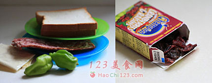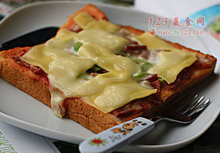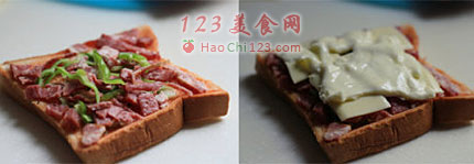二、步骤:1、取土司放在盘子里,表面涂一层番茄酱,撒上培根丁和青椒丝,放几颗蔓越莓葡萄干。