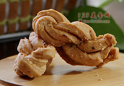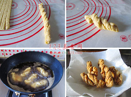 9、锅中注入油,烧至7成热,下入麻花胚。炸制金黄后捞出。