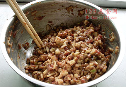 4、最后将切好的香姑粒放入搅好的肉馅中,放入适量香油提下味,拌匀成馅。