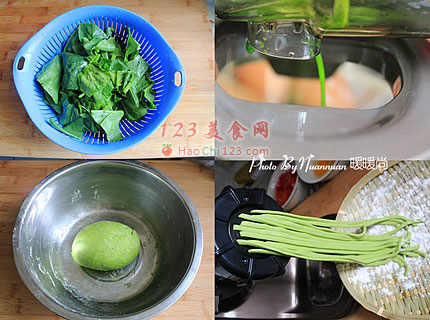 3、取一大点的容器,倒入面粉,分数次倒入菠菜汁,将面粉慢慢的和成软硬适度的面团,然后盖上湿毛巾醒15-30分钟。