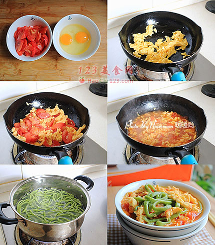 7、下切好的西红柿,加一勺盐和一勺生抽调味,炒至西红柿出汤。