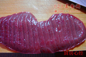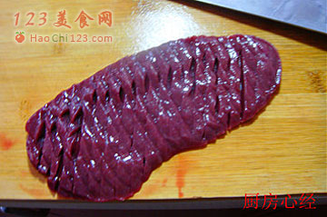 3、厨师有一句话,叫菜板子要学会使边,菜刀要学会使尖。腰花要放在菜板的边上,紧贴着案边,打起花刀才好使。腰花要每隔0.5厘米,打一个斜刀,打到腰花的3/5。