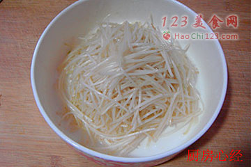 6、锅中做开水,先焯熟豆芽菜,捞出。将豆芽菜码入一个大碗中备用。