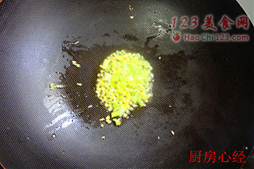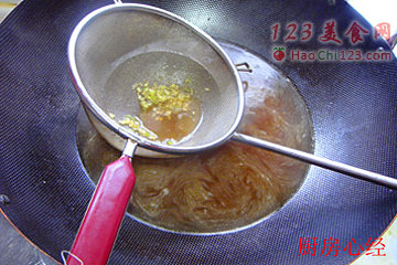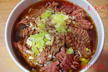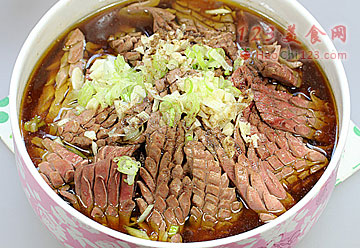 10、将热汤浇在大碗中,撒上葱蒜粒,花椒面后,浇上热油即可。