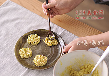 5、在盘子上涂抹少许黄油,取饼干大小的量,摆放在平盘内。