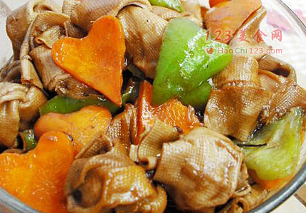 4、锅中少油,烧至七成热,入葱、姜末炝锅,加入酱小火炒匀,加高汤、酱油、白糖烧开,加入豆腐皮结后烧开,加入盐调味,改小火烧15分钟,大火收汁,加青椒和胡萝卜,用鸡精调味即可。