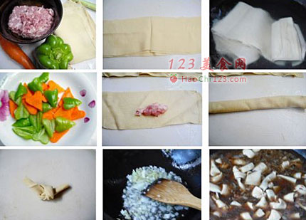 1、先把配料准备好后,再氽豆腐皮,不然氽好的豆腐皮长时间控水部分会风干变色。