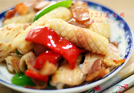 8、培根煸炒变色吐油,倒入鱿鱼,青红椒,放盐,黑胡椒调味,一起煸炒到青红椒断生,加鸡精调味,即可。