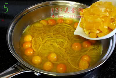 5、干净无油的锅里加入适量的清水,放入冰糖煮至冰糖融化,加入金橘、橙皮、柠檬皮煮8-10分钟,倒入橙肉继续煮至汤汁微微黏稠。