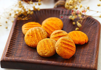 4、将混合物揉成面团,均分成小面团,揉成圆球再轻轻压扁,放入已经铺好锡纸的烤盘,用叉子在表面压出花纹,烤箱上火180度、下火150度预热10分钟,预热好后将烤盘放入中下层,烤约18分钟即可。