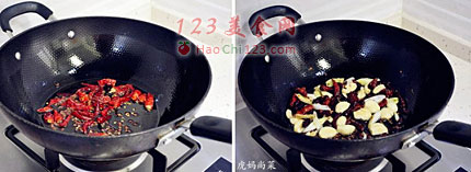 4、再放入葱、姜、蒜,依旧小火煸炒至香味冒出。将配料炒香这步很重要,油的味道丰富了菜才更具美味。