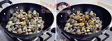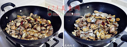 8、再继续翻炒,至蛤蜊全部打开壳就可以关火盛出,千万别炒的时间太长,那样蛤蜊肉会纷纷掉下来的。