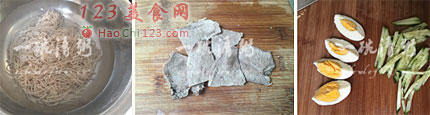9、煮好的鸡蛋对半切开,黄瓜洗净后切丝。
