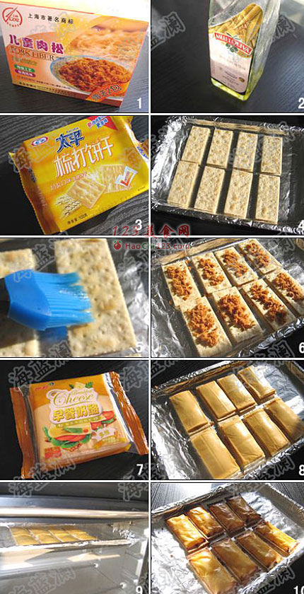 3、6图,将肉松铺在饼干上,四个边缘要留空隙,不要全部铺满。
