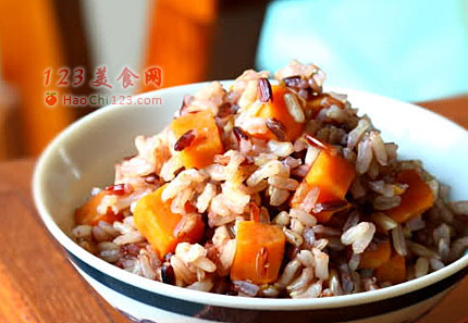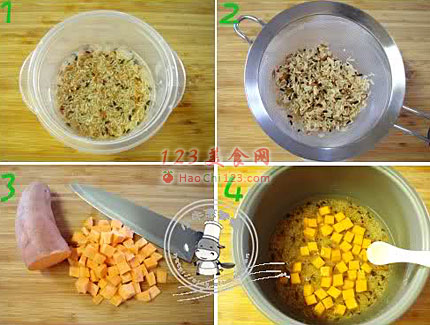 4、将杂粮米和红薯丁放入电饭煲,水量比平时蒸饭多加一倍半的水,再加少许玉米油蒸熟即可。