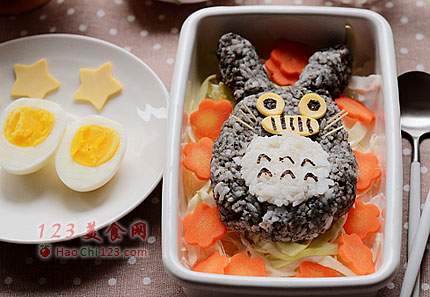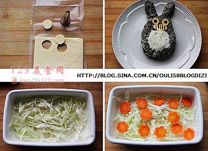 6、绿甘蓝切丝、胡萝卜切片,将龙猫放上,并用沙拉酱等装饰即可。