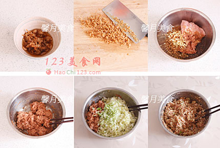 3、海米洗净,用料酒泡软后剁碎调肉馅,这就是天然鲜美的“味精”,是提味儿的法宝。