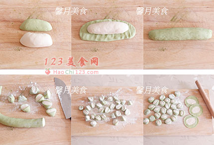 1、用绿色的蔬菜汁分别调制出两种不同颜色的面团。